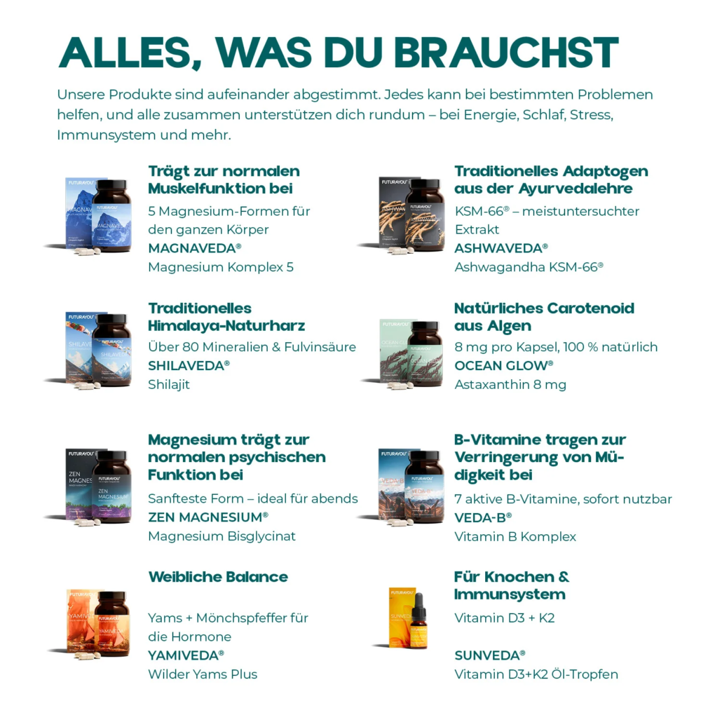Die FUTURAYOU® Longevity-Supplements. Hochwertige Mikronährstoffe für nachhaltige Ergebnisse von innen heraus. Perfekt abgestimmt, um Energie, Regeneration, Schlaf, Stressresistenz und das Immunsystem ganzheitlich zu unterstützen. Wissenschaftlich fundierte Inhaltsstoffe, sorgfältig kombiniert für maximale Bioverfügbarkeit. Frei von unnötigen Zusatzstoffen, entwickelt für höchste Ansprüche. Für die tägliche Routine – um Wohlbefinden, Leistungsfähigkeit und langfristige Gesundheit gezielt zu fördern.